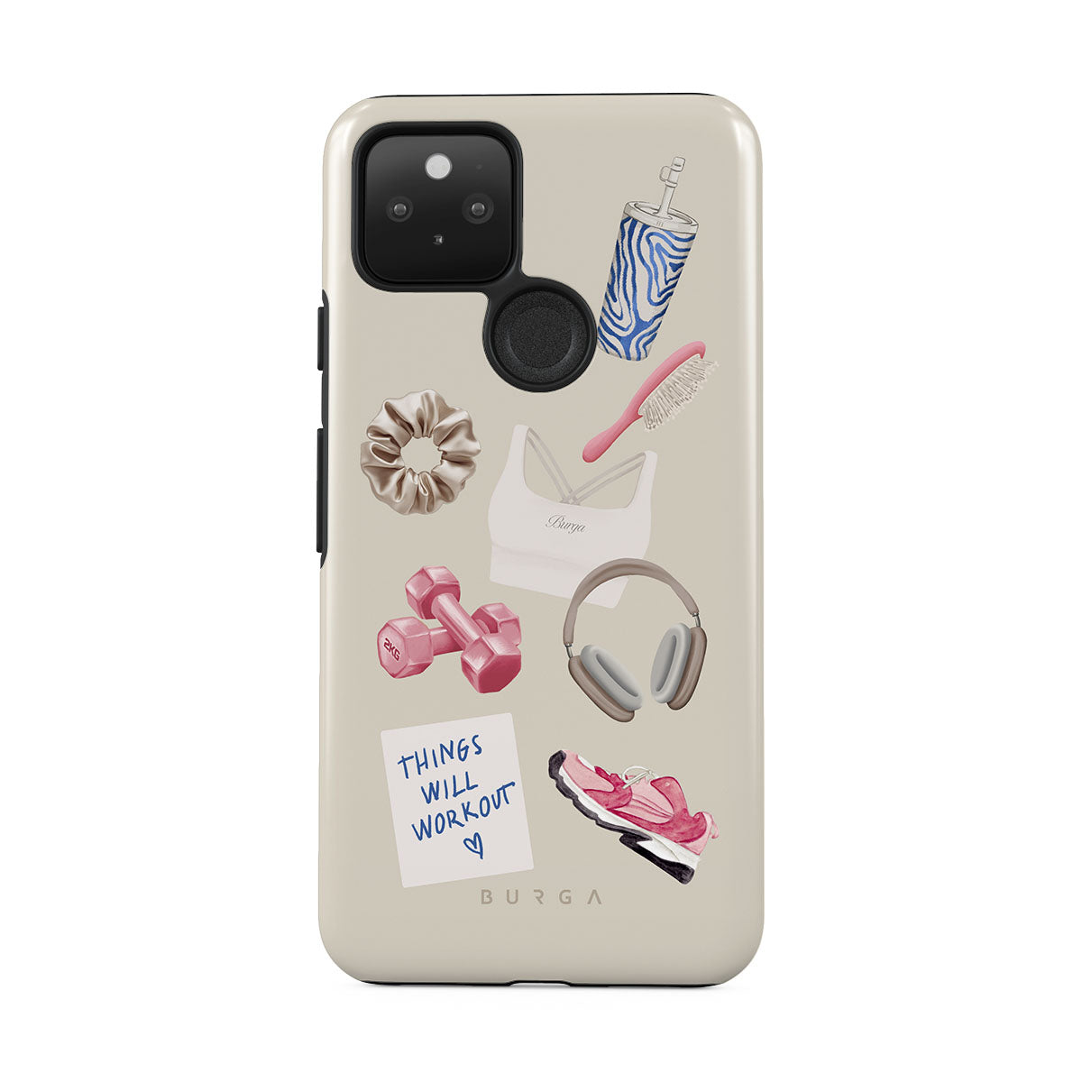 此設計特色:啞鈴、耳機、隨行杯、髮梳、粉色運動鞋、運動內衣、Crunchie能量棒、「一切都會好起來」便利貼