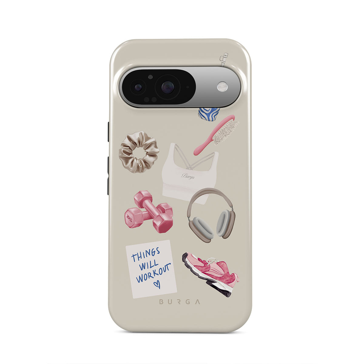 此設計特色:啞鈴、耳機、隨行杯、髮梳、粉色運動鞋、運動內衣、Crunchie能量棒、「一切都會好起來」便利貼