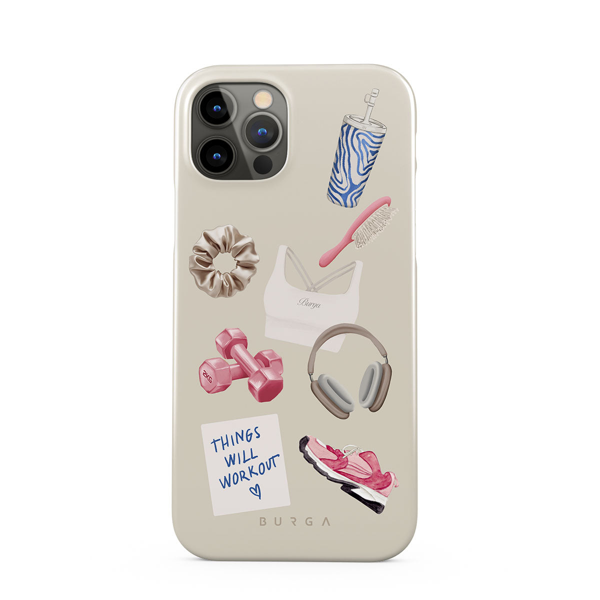 此設計特色:啞鈴、耳機、隨行杯、髮梳、粉色運動鞋、運動內衣、Crunchie能量棒、「一切都會好起來」便利貼