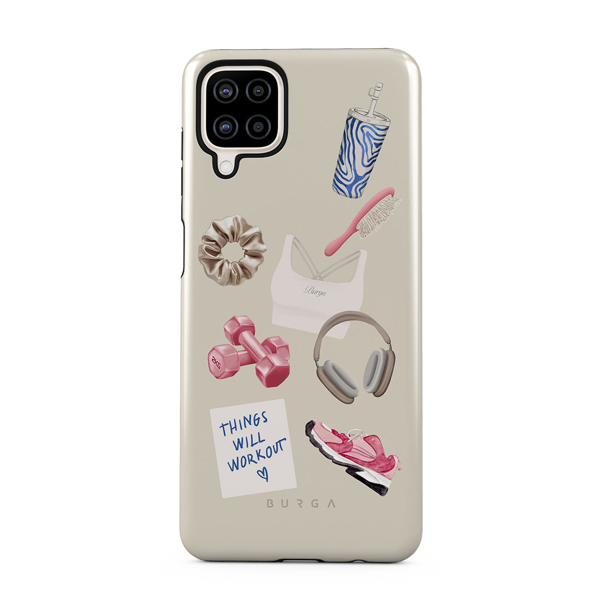 此設計特色:啞鈴、耳機、隨行杯、髮梳、粉色運動鞋、運動內衣、Crunchie能量棒、「一切都會好起來」便利貼