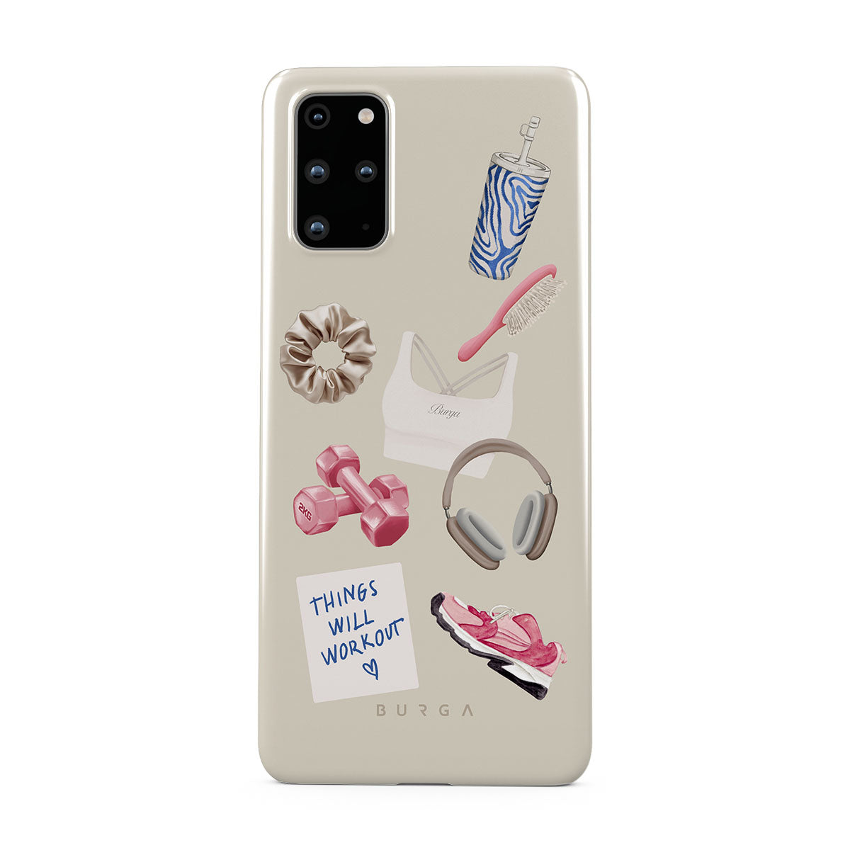 此設計特色:啞鈴、耳機、隨行杯、髮梳、粉色運動鞋、運動內衣、Crunchie能量棒、「一切都會好起來」便利貼