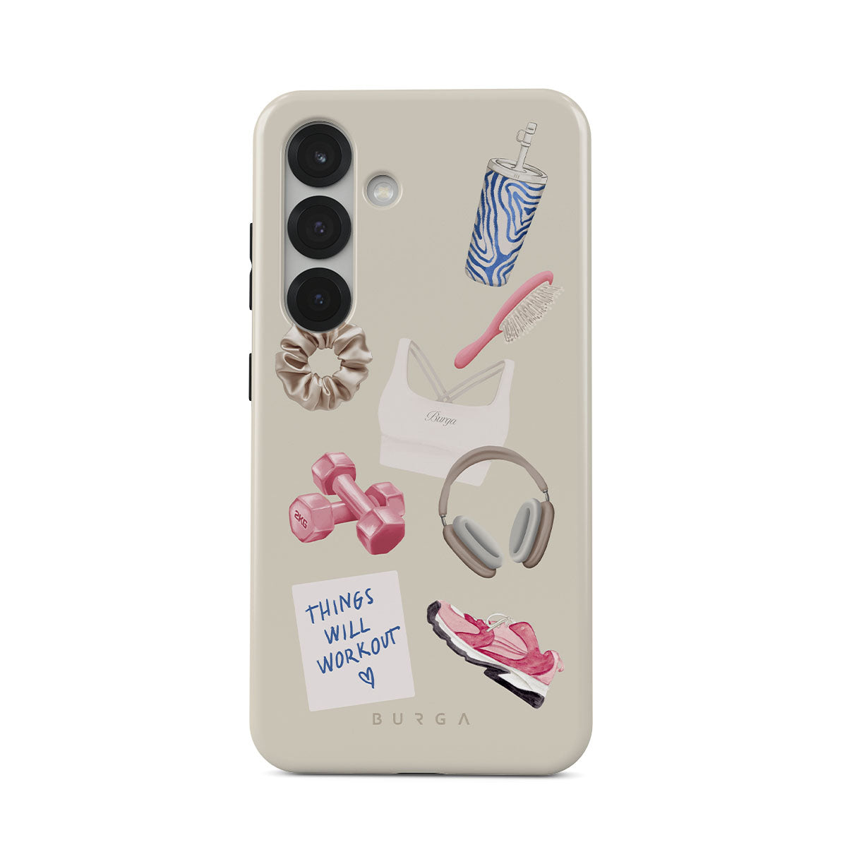 此設計特色:啞鈴、耳機、隨行杯、髮梳、粉色運動鞋、運動內衣、Crunchie能量棒、「一切都會好起來」便利貼