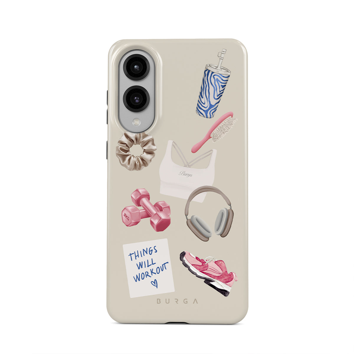此設計特色:啞鈴、耳機、隨行杯、髮梳、粉色運動鞋、運動內衣、Crunchie能量棒、「一切都會好起來」便利貼