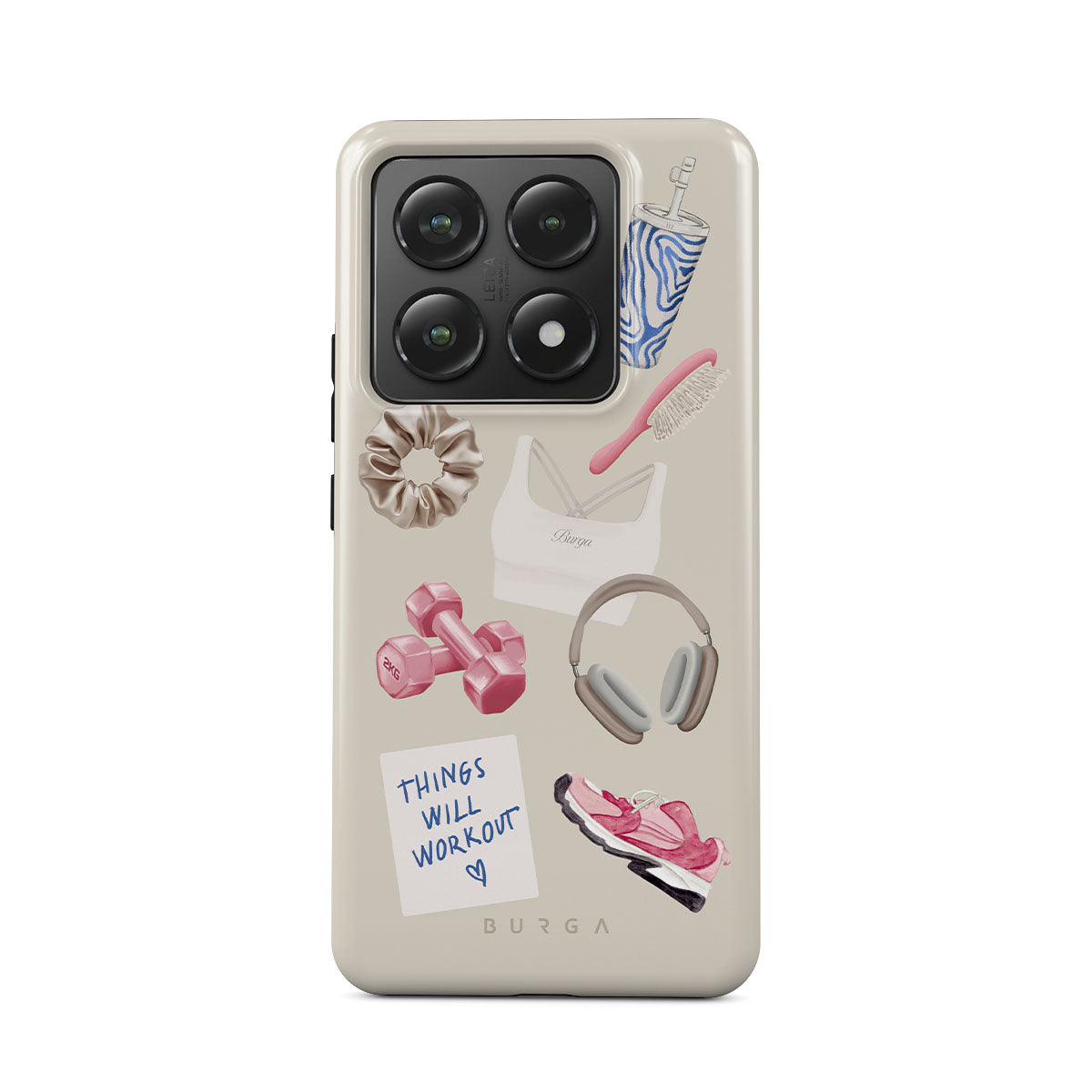 此設計特色:啞鈴、耳機、隨行杯、髮梳、粉色運動鞋、運動內衣、Crunchie能量棒、「一切都會好起來」便利貼