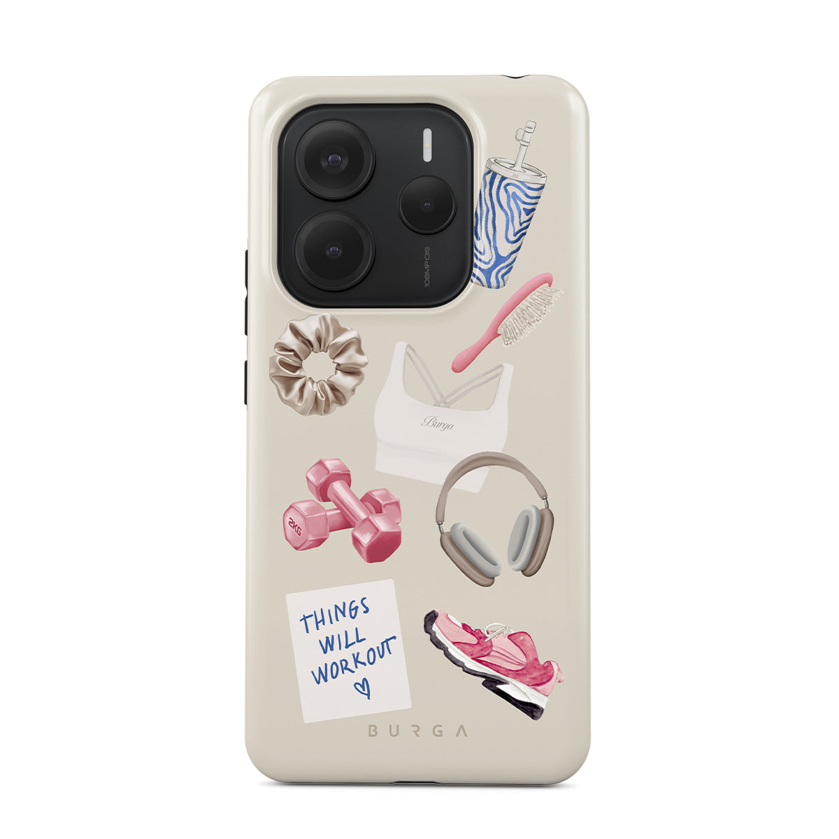 此設計特色:啞鈴、耳機、隨行杯、髮梳、粉色運動鞋、運動內衣、Crunchie能量棒、「一切都會好起來」便利貼