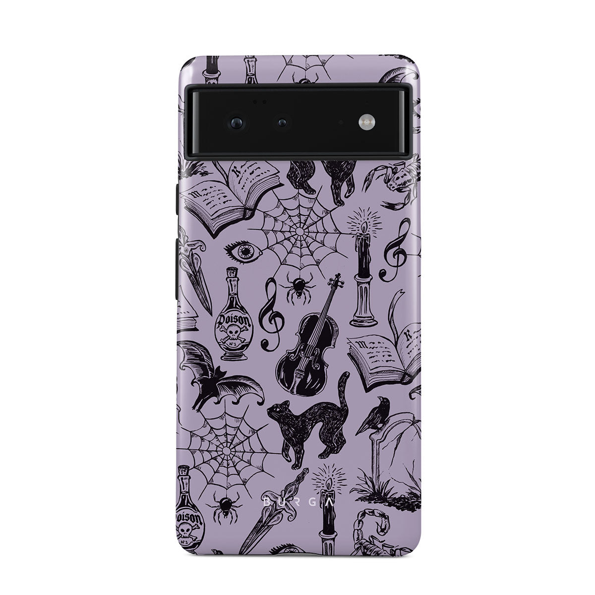 此設計特色:哥特風格塗鴉、神秘元素、蜘蛛、蜘蛛網、貓、提琴、眼睛、蠟燭、匕首、書本、蝙蝠、烏鴉、蠍子