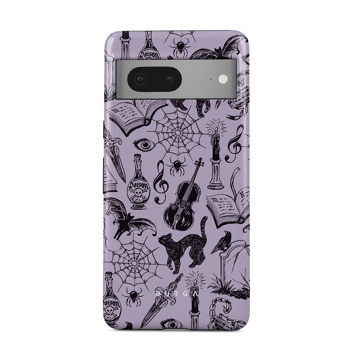 此設計特色:哥特風格塗鴉、神秘元素、蜘蛛、蜘蛛網、貓、提琴、眼睛、蠟燭、匕首、書本、蝙蝠、烏鴉、蠍子