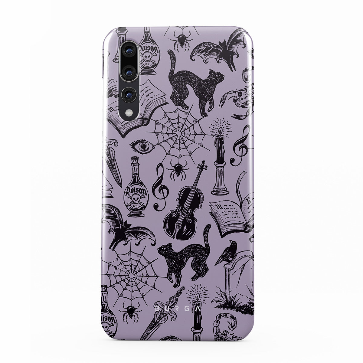 此設計特色:哥特風格塗鴉、神秘元素、蜘蛛、蜘蛛網、貓、提琴、眼睛、蠟燭、匕首、書本、蝙蝠、烏鴉、蠍子