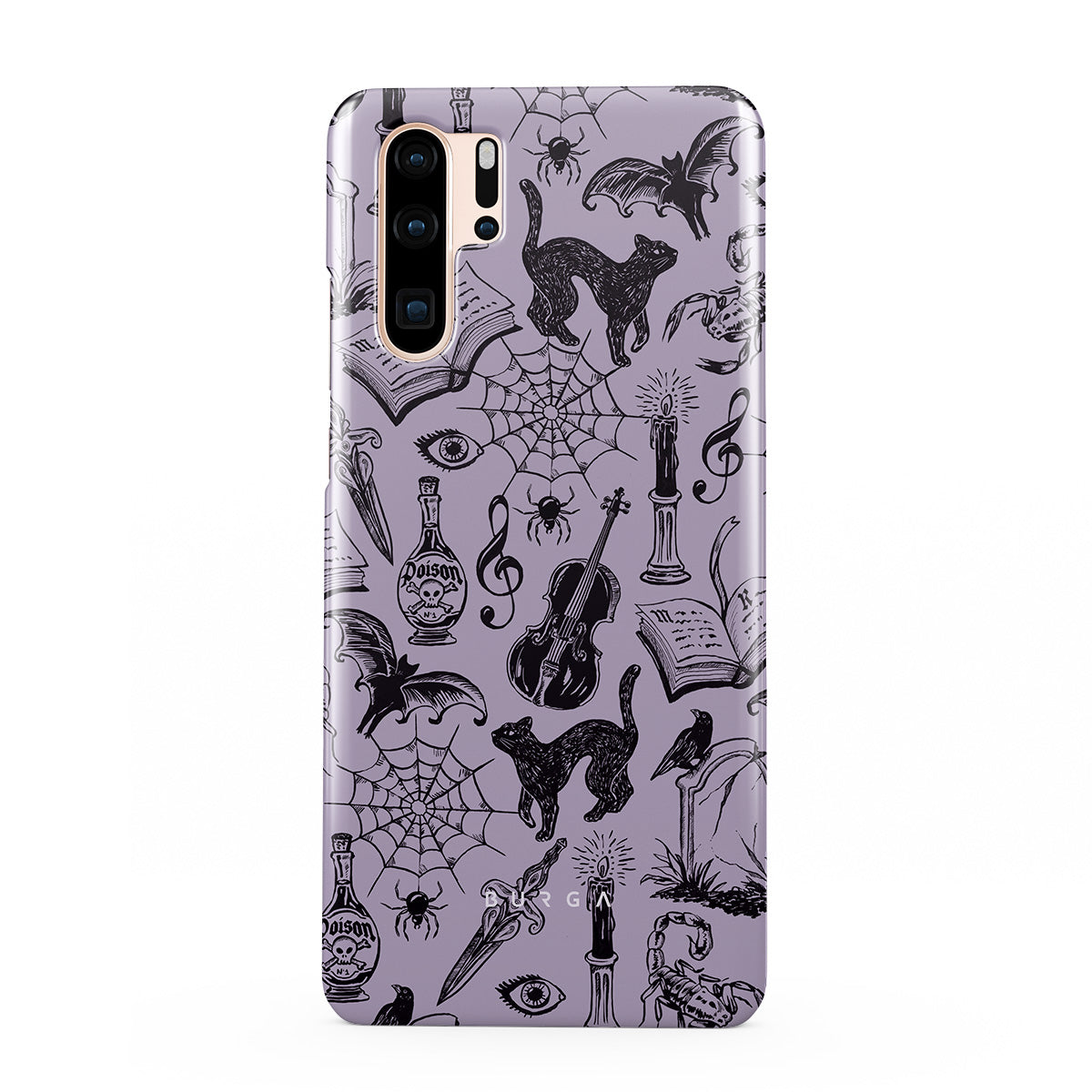 此設計特色:哥特風格塗鴉、神秘元素、蜘蛛、蜘蛛網、貓、提琴、眼睛、蠟燭、匕首、書本、蝙蝠、烏鴉、蠍子
