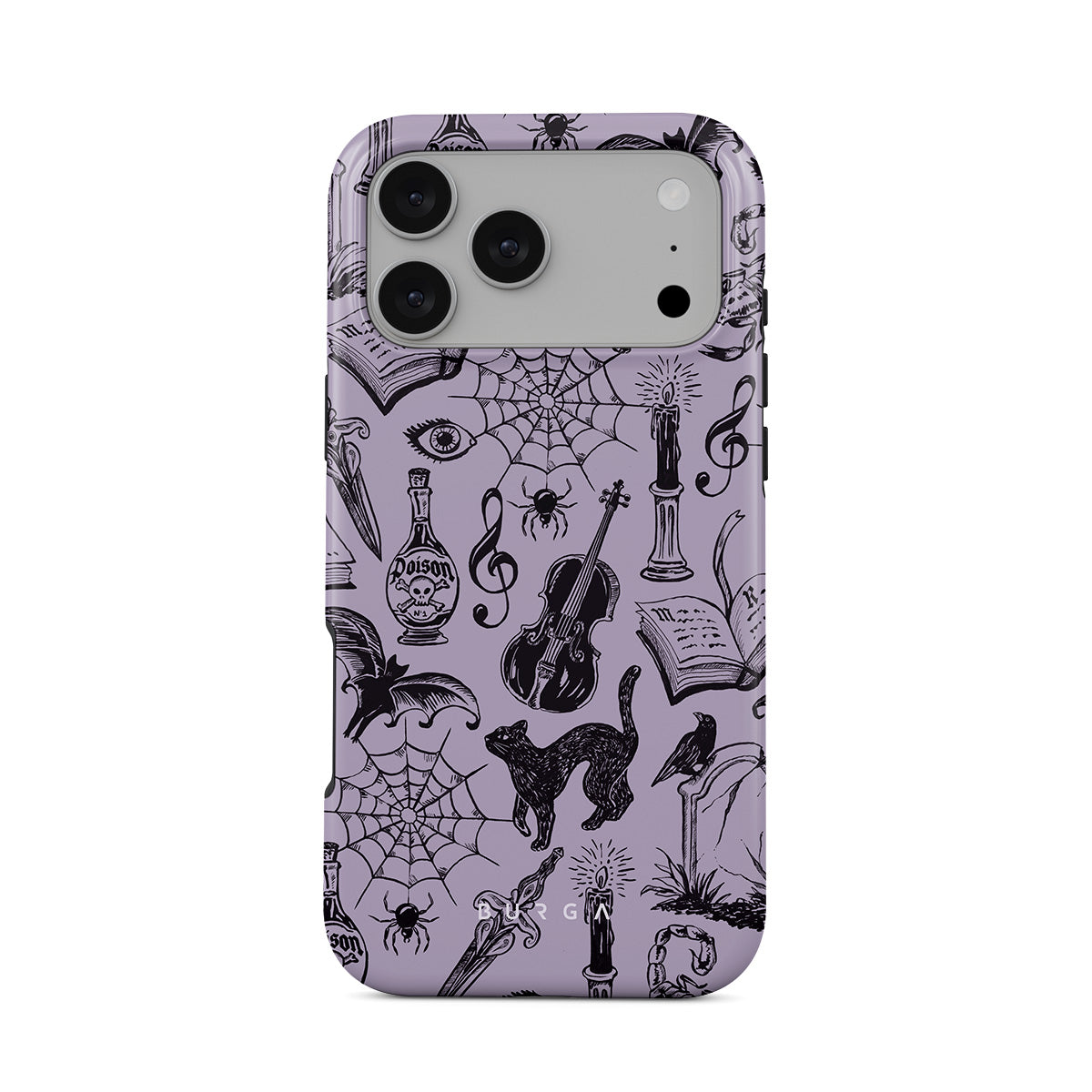 此設計特色:哥特風格塗鴉、神秘元素、蜘蛛、蜘蛛網、貓、提琴、眼睛、蠟燭、匕首、書本、蝙蝠、烏鴉、蠍子