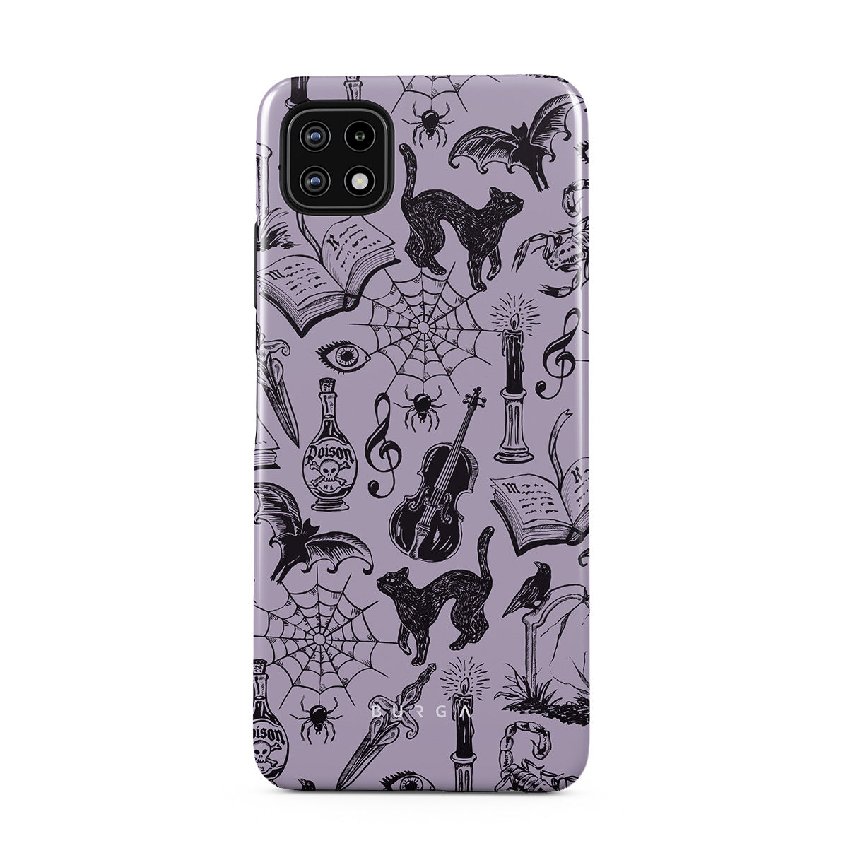 此設計特色:哥特風格塗鴉、神秘元素、蜘蛛、蜘蛛網、貓、提琴、眼睛、蠟燭、匕首、書本、蝙蝠、烏鴉、蠍子