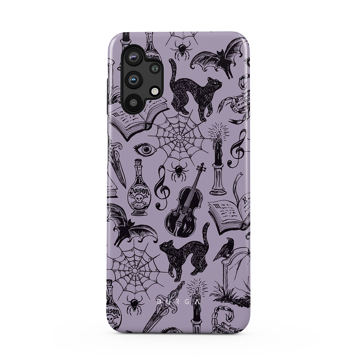 此設計特色:哥特風格塗鴉、神秘元素、蜘蛛、蜘蛛網、貓、提琴、眼睛、蠟燭、匕首、書本、蝙蝠、烏鴉、蠍子