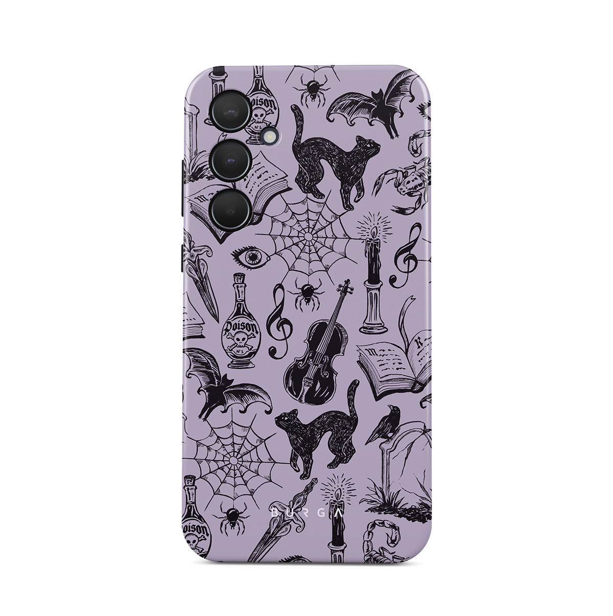 此設計特色:哥特風格塗鴉、神秘元素、蜘蛛、蜘蛛網、貓、提琴、眼睛、蠟燭、匕首、書本、蝙蝠、烏鴉、蠍子