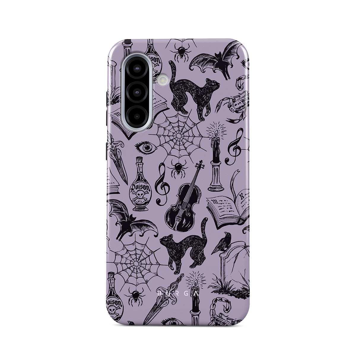 此設計特色:哥特風格塗鴉、神秘元素、蜘蛛、蜘蛛網、貓、提琴、眼睛、蠟燭、匕首、書本、蝙蝠、烏鴉、蠍子