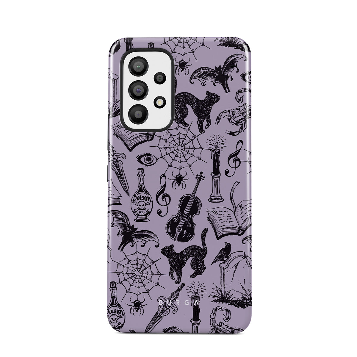 此設計特色:哥特風格塗鴉、神秘元素、蜘蛛、蜘蛛網、貓、提琴、眼睛、蠟燭、匕首、書本、蝙蝠、烏鴉、蠍子