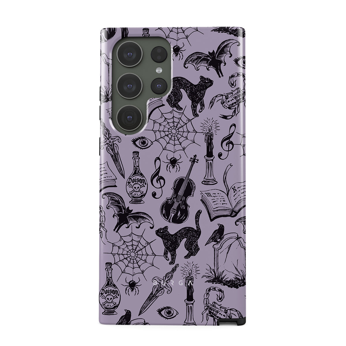 此設計特色:哥特風格塗鴉、神秘元素、蜘蛛、蜘蛛網、貓、提琴、眼睛、蠟燭、匕首、書本、蝙蝠、烏鴉、蠍子