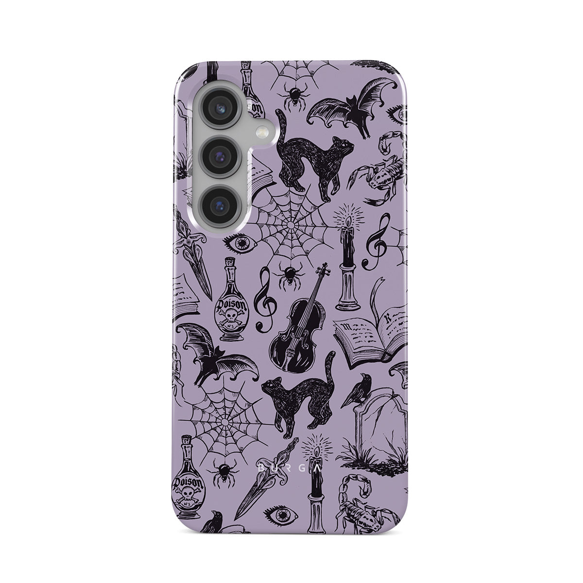 此設計特色:哥特風格塗鴉、神秘元素、蜘蛛、蜘蛛網、貓、提琴、眼睛、蠟燭、匕首、書本、蝙蝠、烏鴉、蠍子
