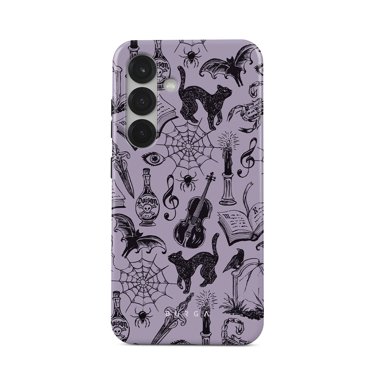 此設計特色:哥特風格塗鴉、神秘元素、蜘蛛、蜘蛛網、貓、提琴、眼睛、蠟燭、匕首、書本、蝙蝠、烏鴉、蠍子