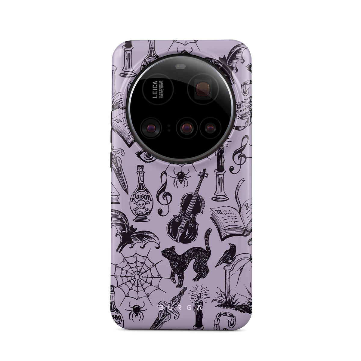 此設計特色:哥特風格塗鴉、神秘元素、蜘蛛、蜘蛛網、貓、提琴、眼睛、蠟燭、匕首、書本、蝙蝠、烏鴉、蠍子