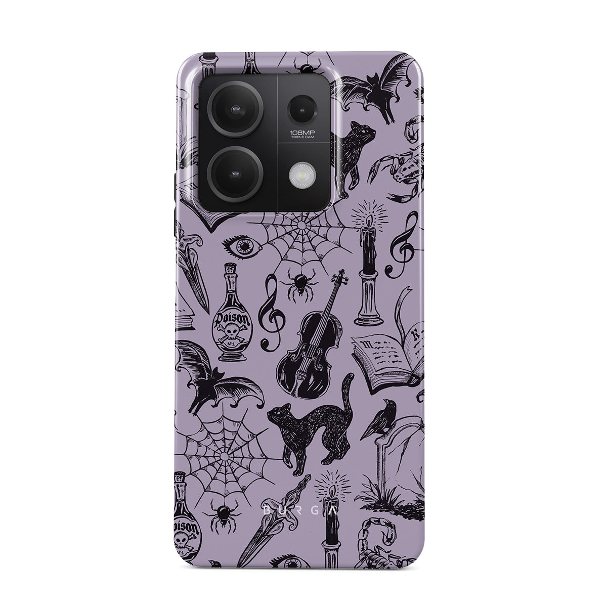 此設計特色:哥特風格塗鴉、神秘元素、蜘蛛、蜘蛛網、貓、提琴、眼睛、蠟燭、匕首、書本、蝙蝠、烏鴉、蠍子