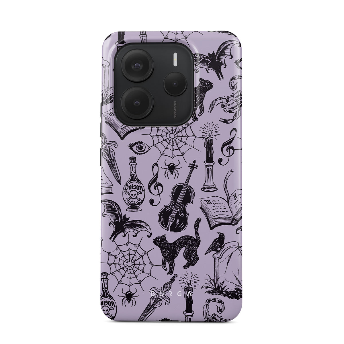 此設計特色:哥特風格塗鴉、神秘元素、蜘蛛、蜘蛛網、貓、提琴、眼睛、蠟燭、匕首、書本、蝙蝠、烏鴉、蠍子