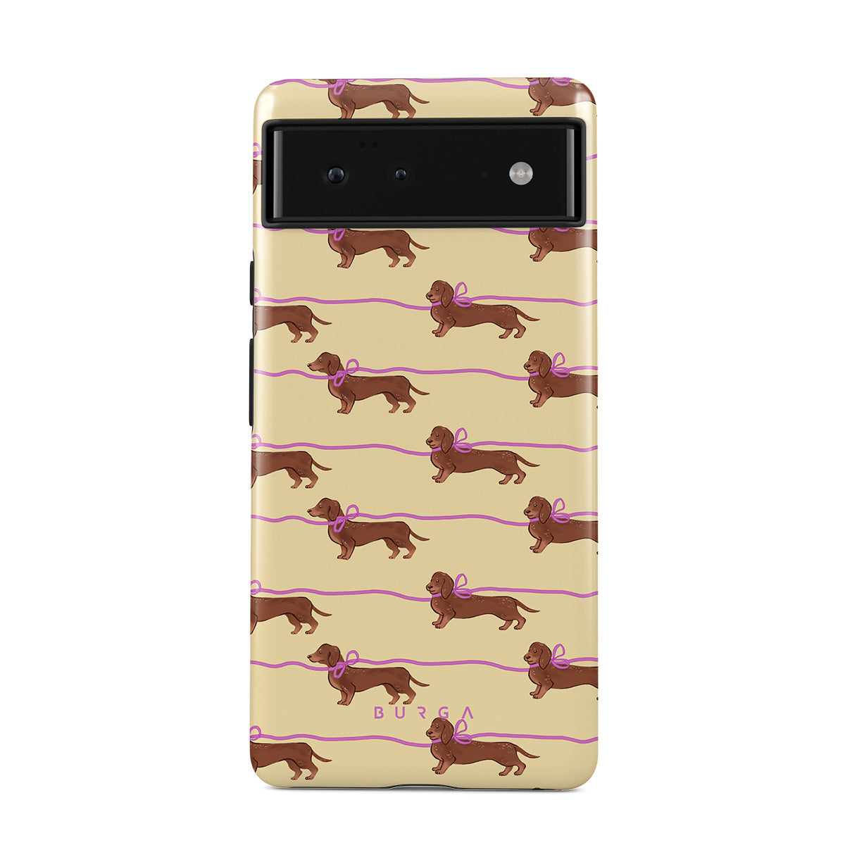 此設計特色: 戴著粉紅蝴蝶結的臘腸狗,非常可愛。