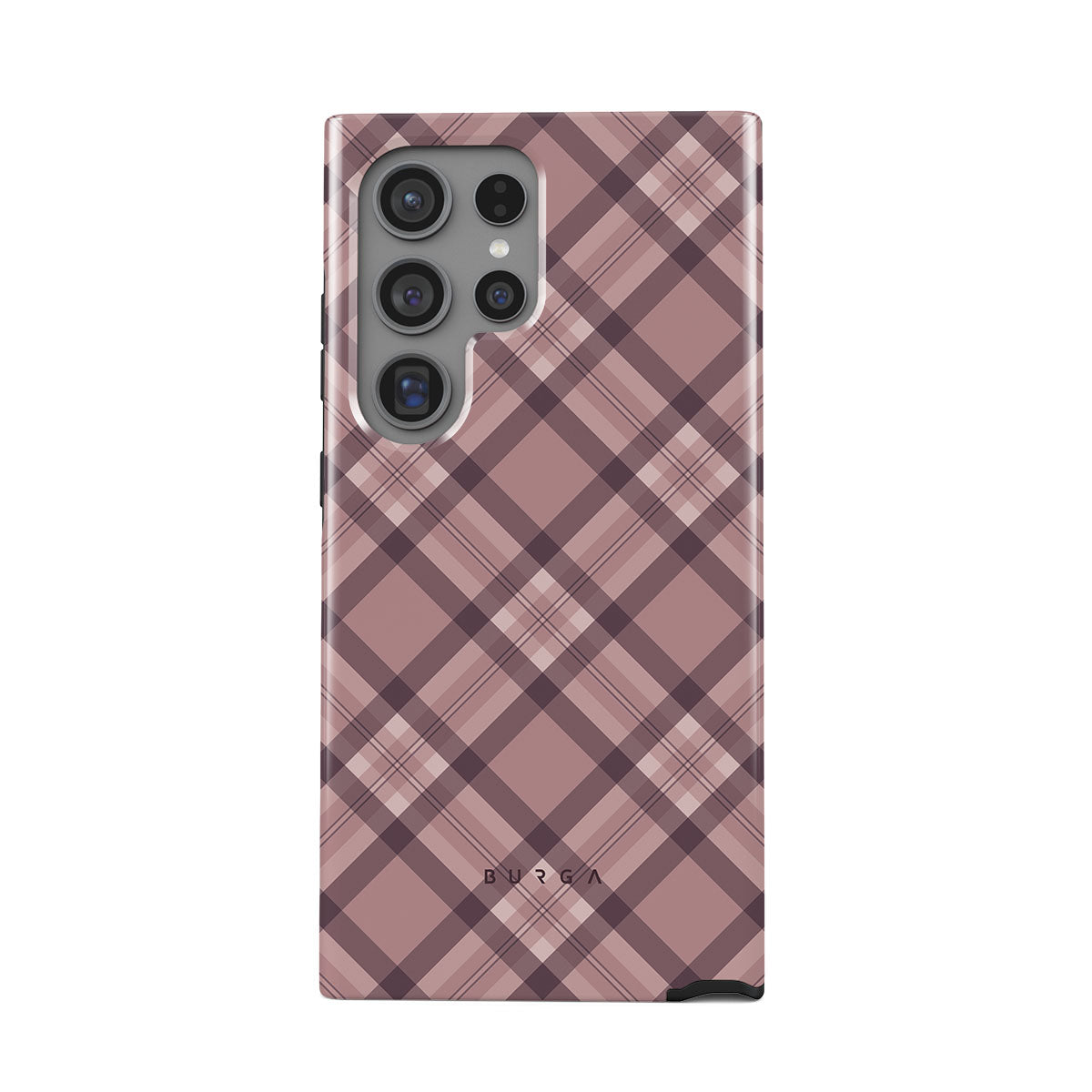此設計特色包含:粉紅色和灰色格紋圖案、格子樣式
