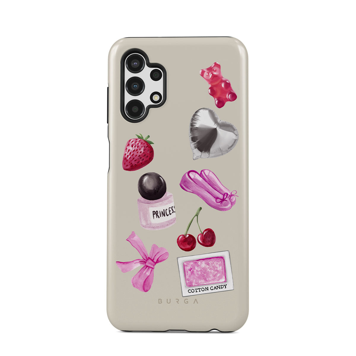 此設計特色:粉色蝴蝶結、銀色愛心氣球、香水瓶、草莓、櫻桃、粉色芭蕾舞鞋、棉花糖貼紙、粉色小熊軟糖