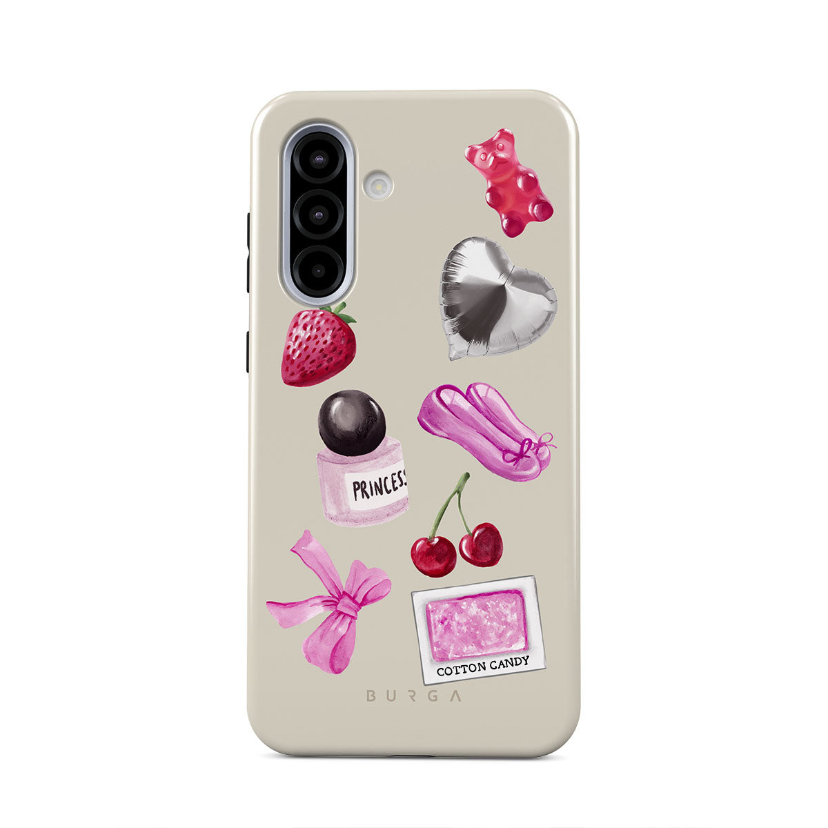 此設計特色:粉色蝴蝶結、銀色愛心氣球、香水瓶、草莓、櫻桃、粉色芭蕾舞鞋、棉花糖貼紙、粉色小熊軟糖