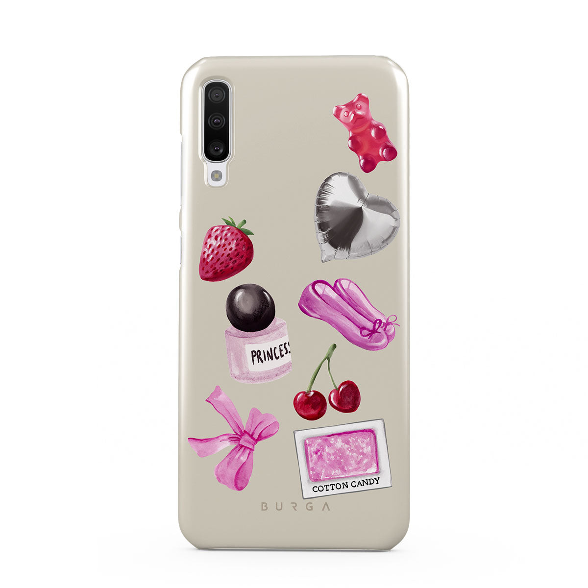 此設計特色:粉色蝴蝶結、銀色愛心氣球、香水瓶、草莓、櫻桃、粉色芭蕾舞鞋、棉花糖貼紙、粉色小熊軟糖
