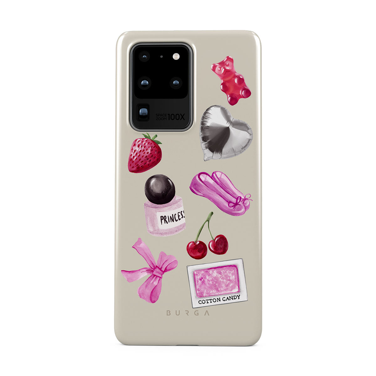此設計特色:粉色蝴蝶結、銀色愛心氣球、香水瓶、草莓、櫻桃、粉色芭蕾舞鞋、棉花糖貼紙、粉色小熊軟糖
