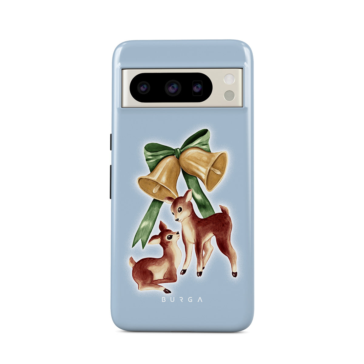 此設計特色:復古馴鹿,聖誕鈴鐺,金鈴,復古馴鹿插畫,小鹿,淺藍色背景