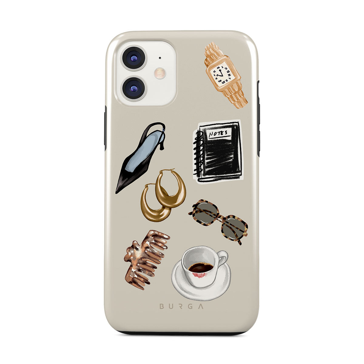 此設計特色:黑色高跟鞋、金色圈型耳環、黑色筆記本、咖啡杯、玳瑁花紋眼鏡、棕色髮圈、復古金色手錶