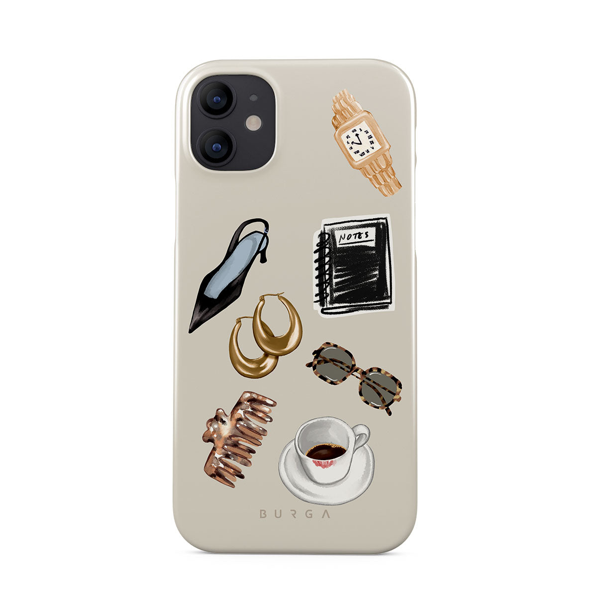 此設計特色:黑色高跟鞋、金色圈型耳環、黑色筆記本、咖啡杯、玳瑁花紋眼鏡、棕色髮圈、復古金色手錶