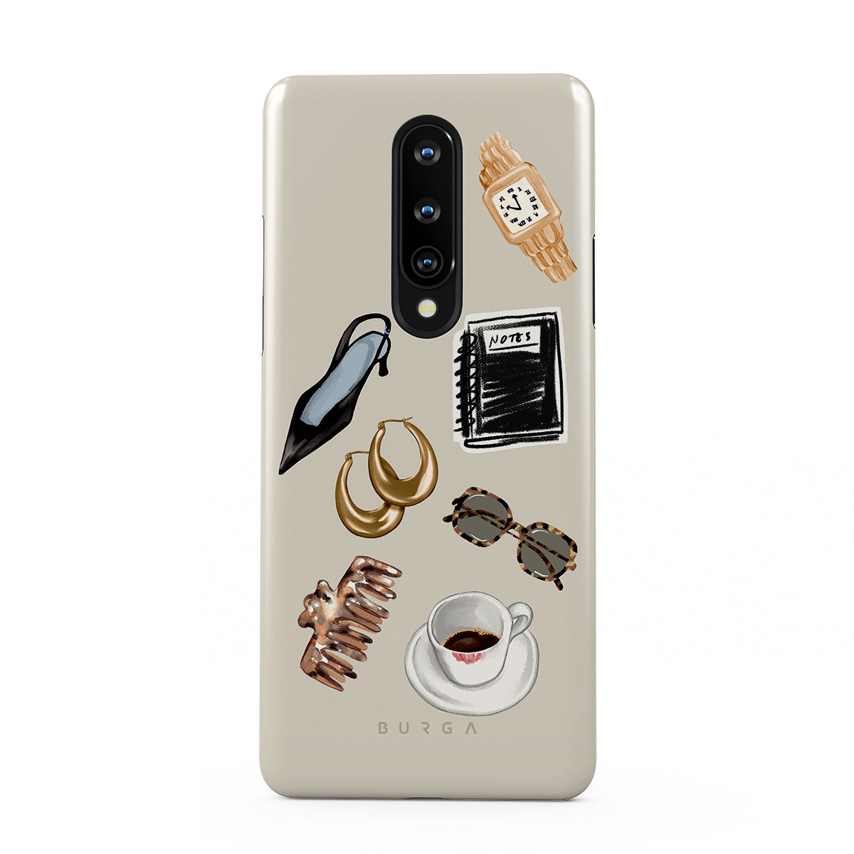 此設計特色:黑色高跟鞋、金色圈型耳環、黑色筆記本、咖啡杯、玳瑁花紋眼鏡、棕色髮圈、復古金色手錶