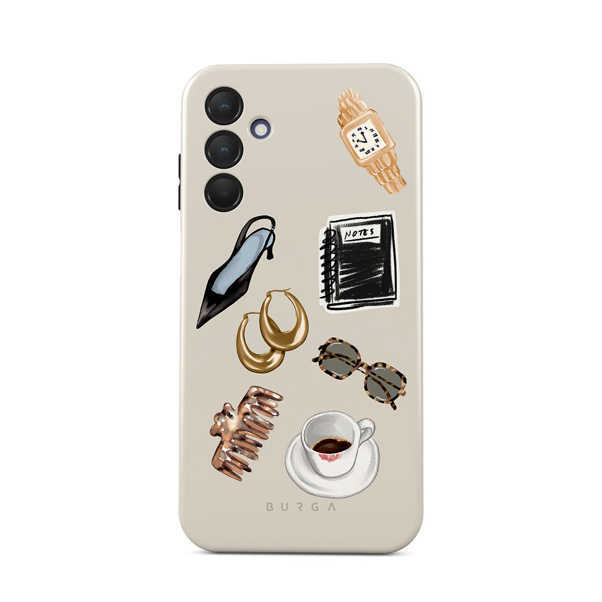 此設計特色:黑色高跟鞋、金色圈型耳環、黑色筆記本、咖啡杯、玳瑁花紋眼鏡、棕色髮圈、復古金色手錶