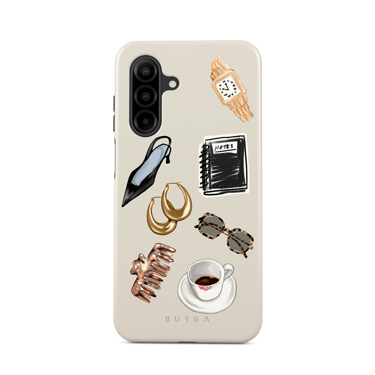 此設計特色:黑色高跟鞋、金色圈型耳環、黑色筆記本、咖啡杯、玳瑁花紋眼鏡、棕色髮圈、復古金色手錶