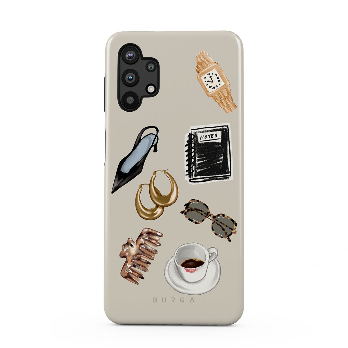 此設計特色:黑色高跟鞋、金色圈型耳環、黑色筆記本、咖啡杯、玳瑁花紋眼鏡、棕色髮圈、復古金色手錶