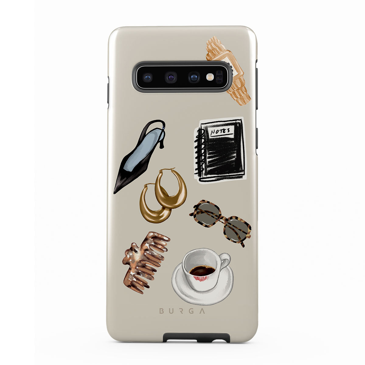 此設計特色:黑色高跟鞋、金色圈型耳環、黑色筆記本、咖啡杯、玳瑁花紋眼鏡、棕色髮圈、復古金色手錶