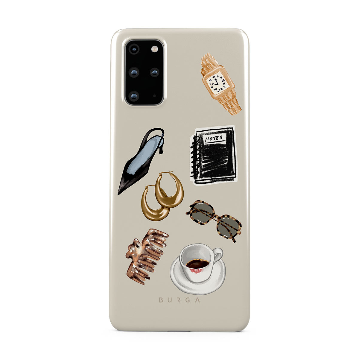 此設計特色:黑色高跟鞋、金色圈型耳環、黑色筆記本、咖啡杯、玳瑁花紋眼鏡、棕色髮圈、復古金色手錶