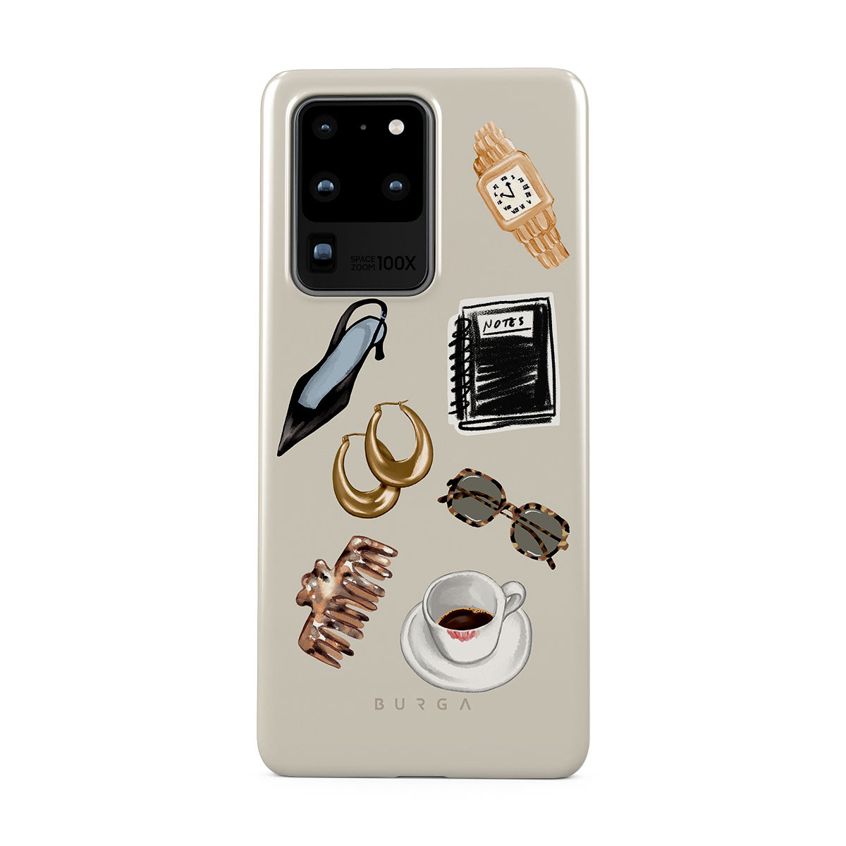 此設計特色:黑色高跟鞋、金色圈型耳環、黑色筆記本、咖啡杯、玳瑁花紋眼鏡、棕色髮圈、復古金色手錶