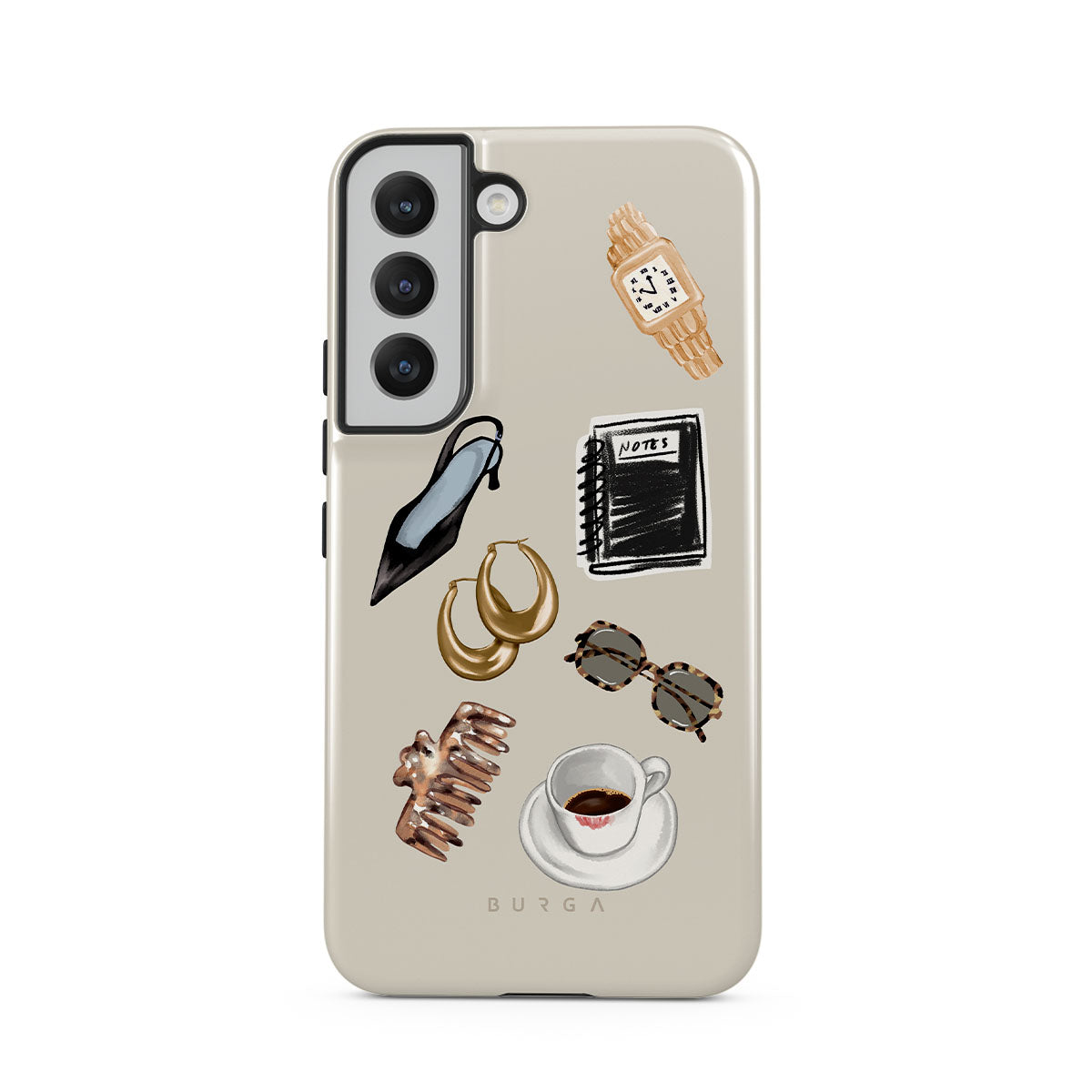 此設計特色:黑色高跟鞋、金色圈型耳環、黑色筆記本、咖啡杯、玳瑁花紋眼鏡、棕色髮圈、復古金色手錶