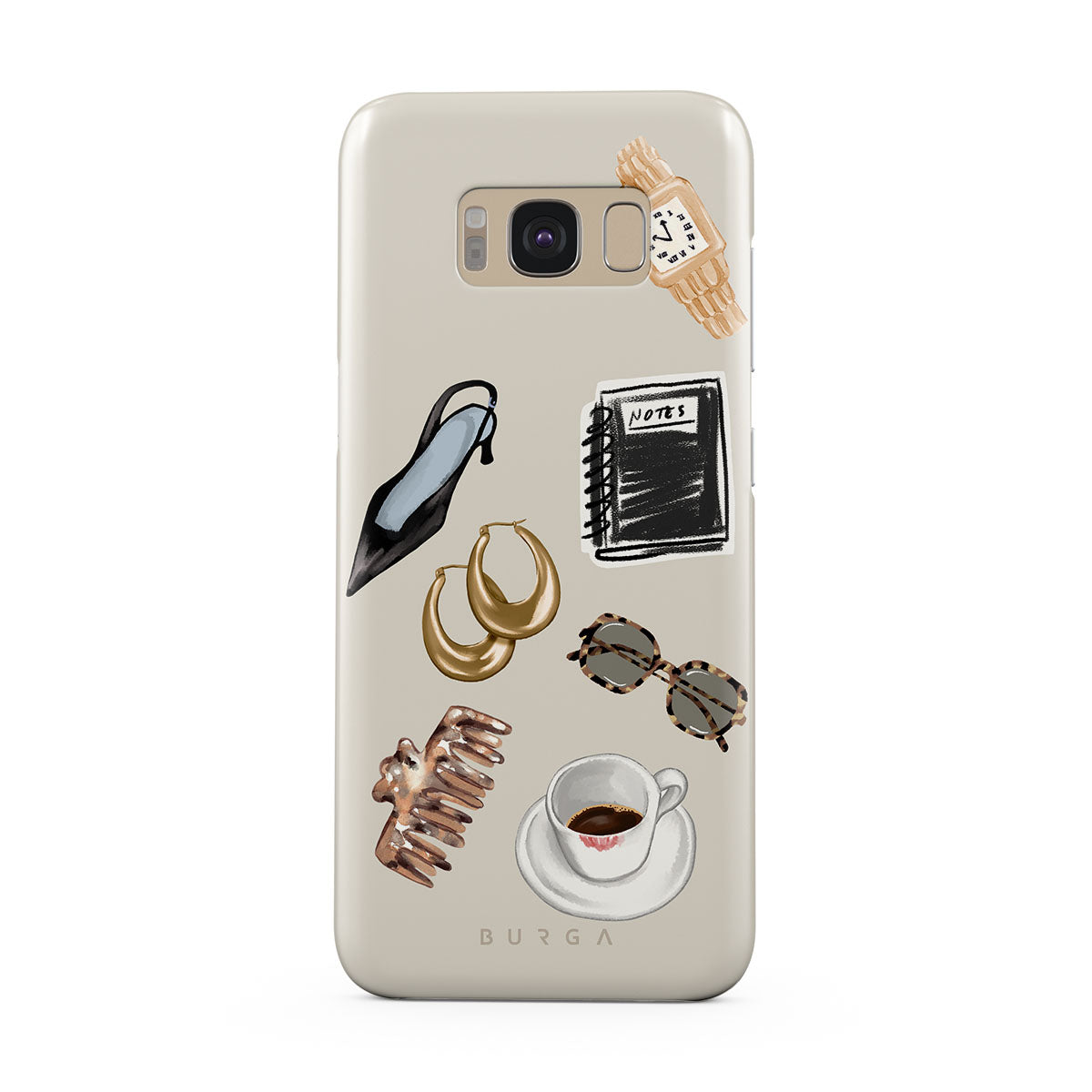此設計特色:黑色高跟鞋、金色圈型耳環、黑色筆記本、咖啡杯、玳瑁花紋眼鏡、棕色髮圈、復古金色手錶