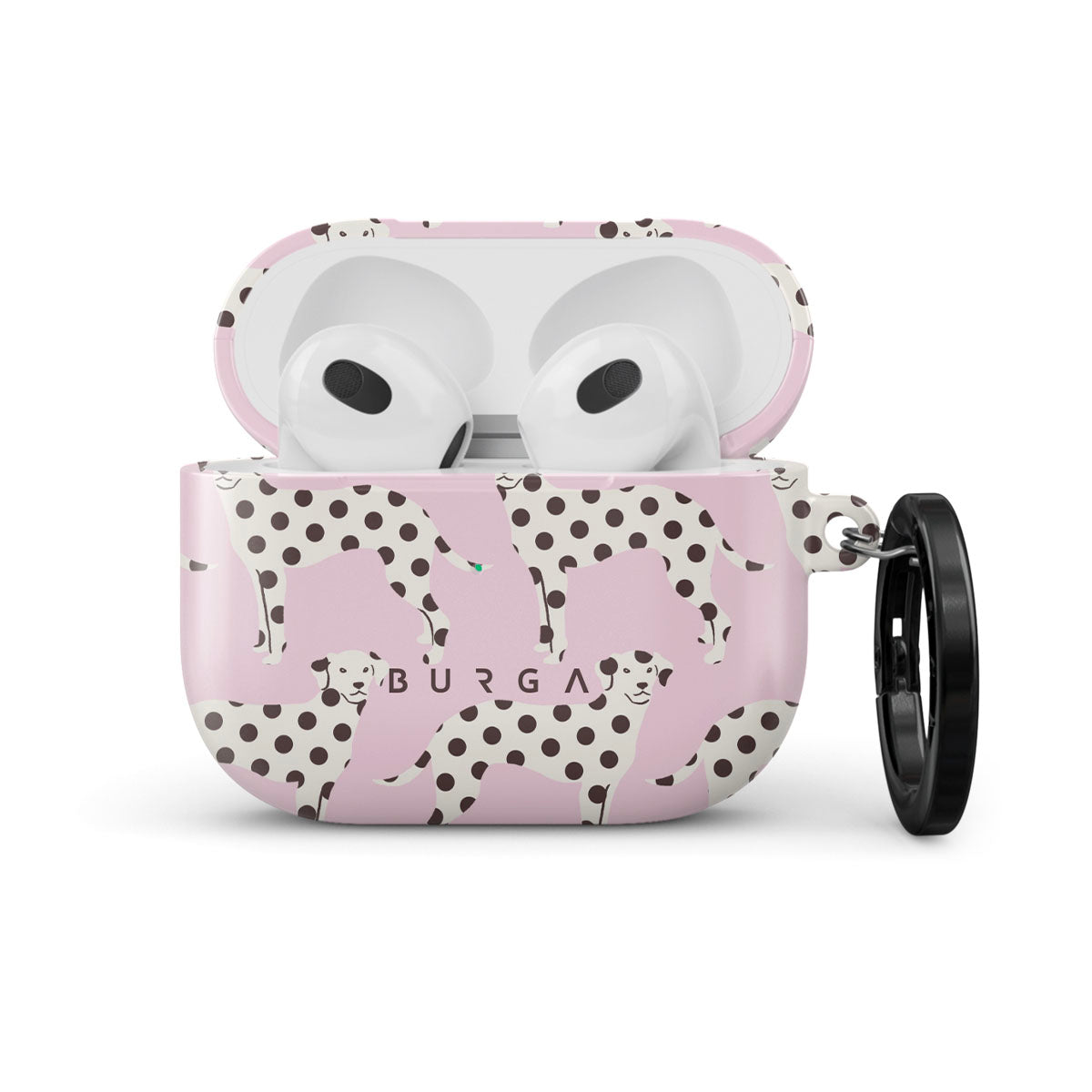 此設計特色: 粉紅背景上的達爾馬西亞狗狗圖案。