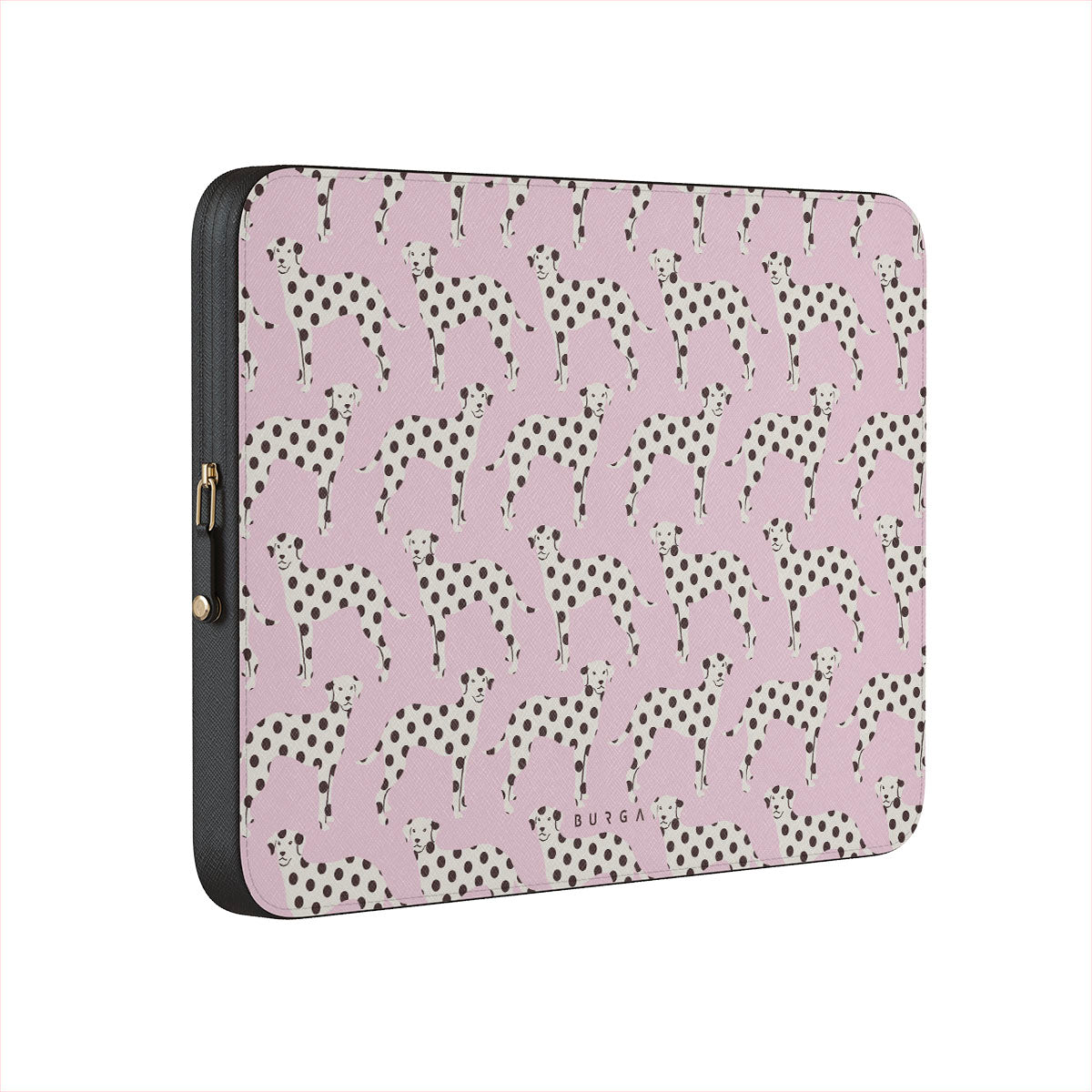 此設計特色: 粉紅背景上的達爾馬西亞狗狗圖案。