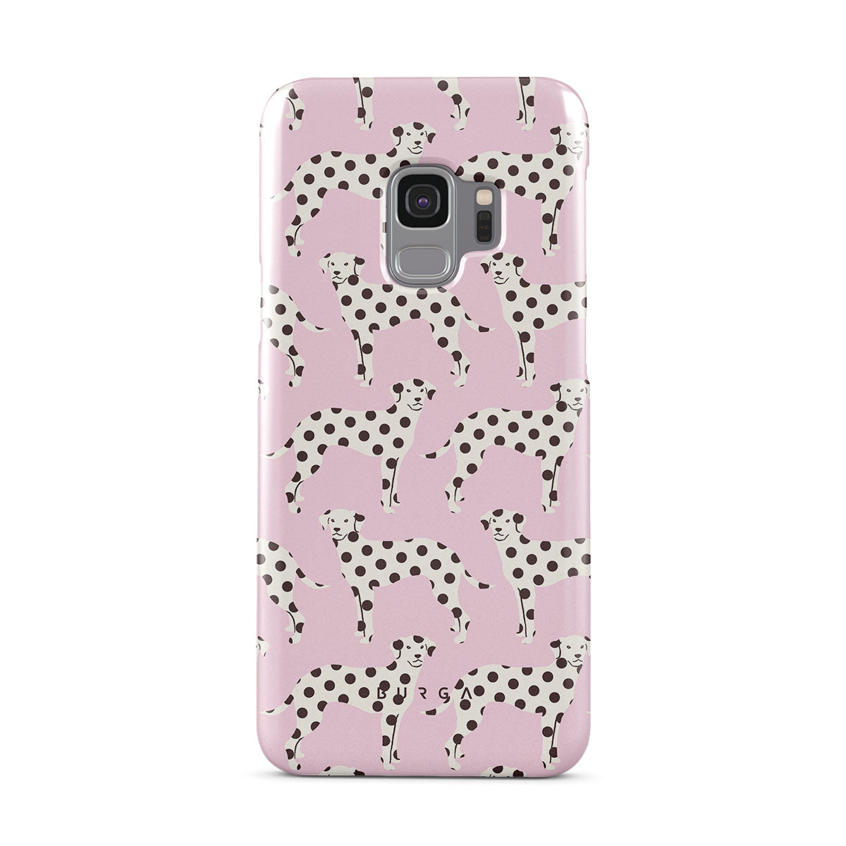 此設計特色: 粉紅背景上的達爾馬西亞狗狗圖案。