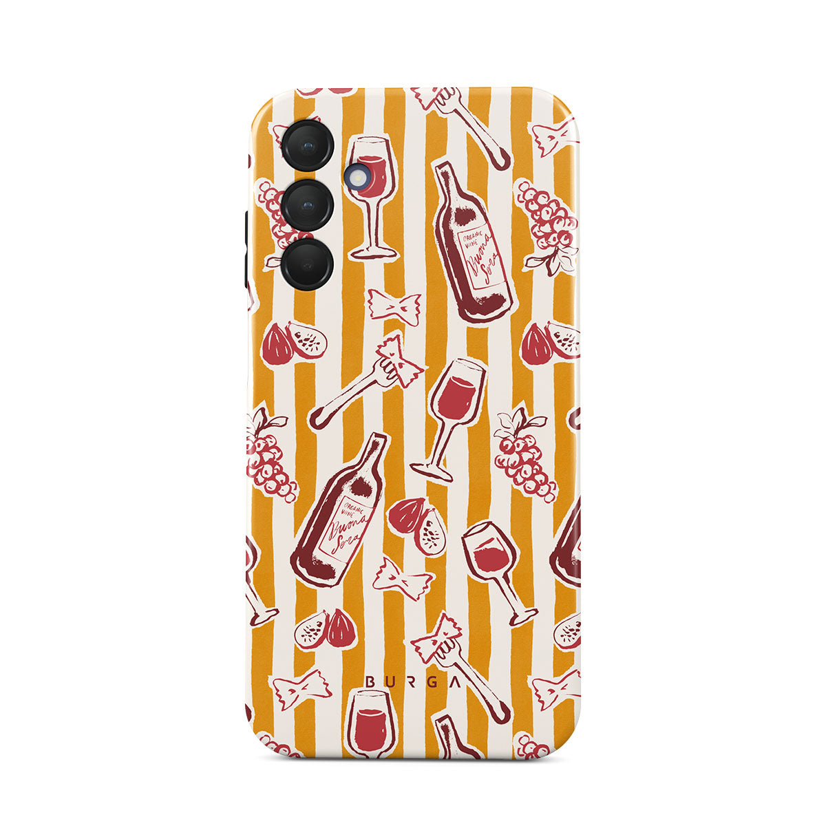 此設計特色:水果、無花果、葡萄、叉子、義大利麵、葡萄酒、酒杯、條紋