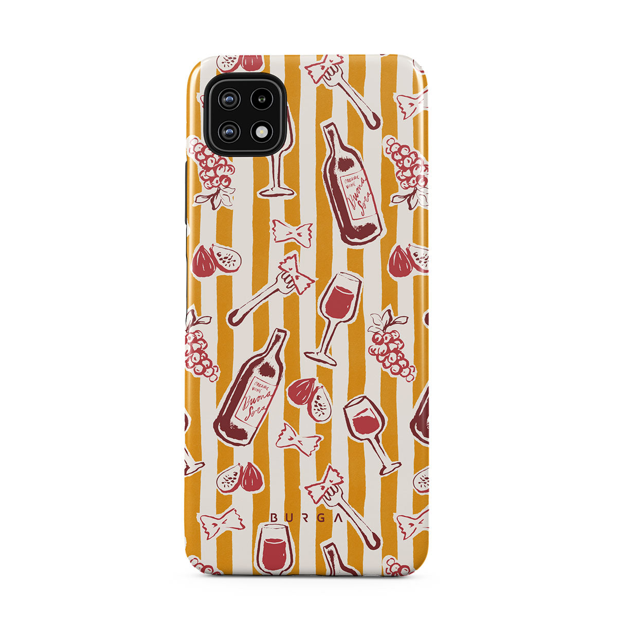 此設計特色:水果、無花果、葡萄、叉子、義大利麵、葡萄酒、酒杯、條紋