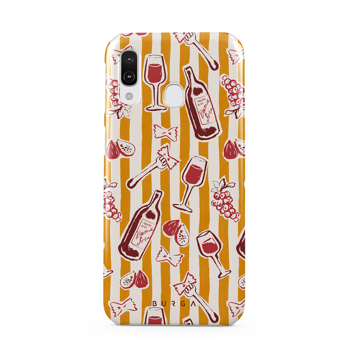 此設計特色:水果、無花果、葡萄、叉子、義大利麵、葡萄酒、酒杯、條紋