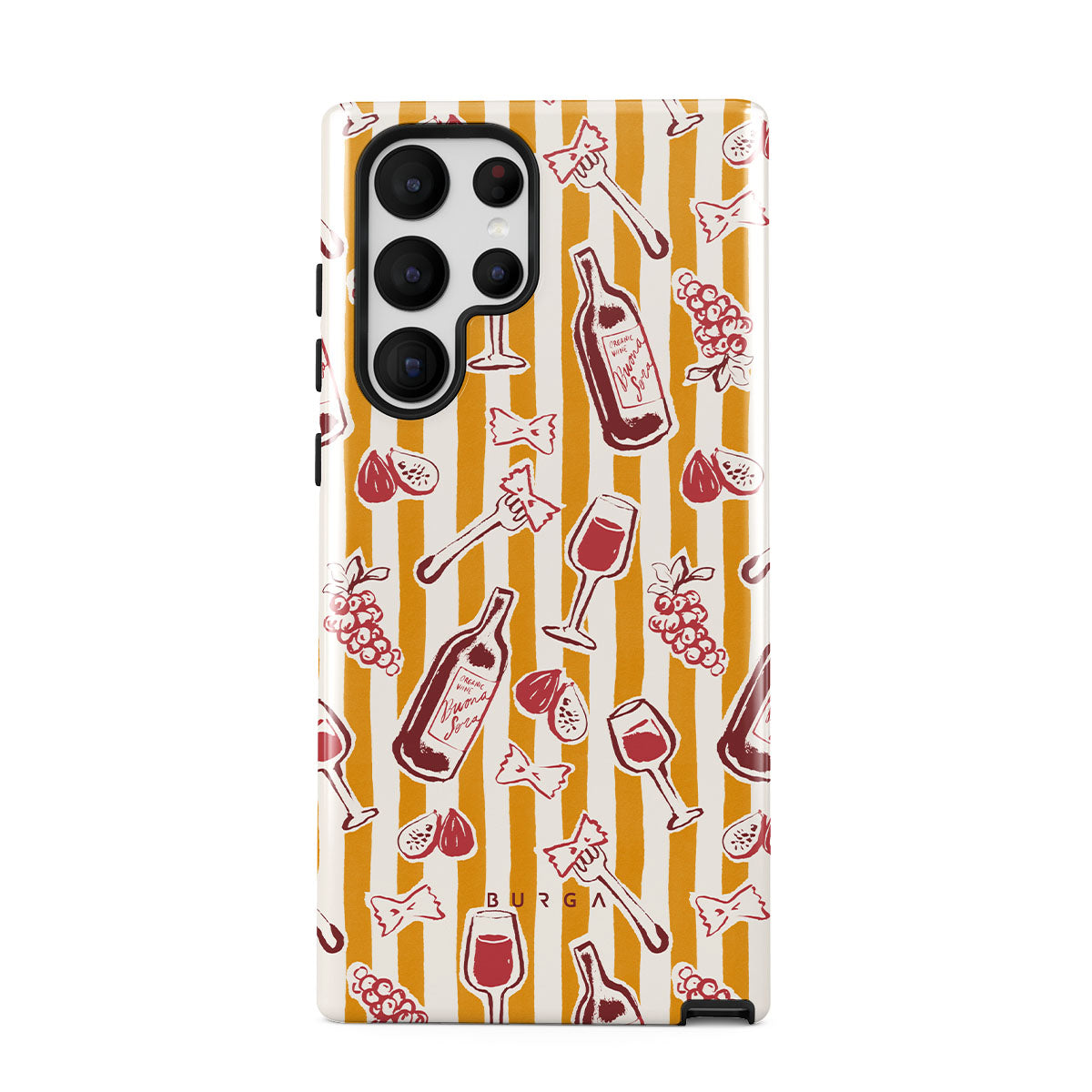 此設計特色:水果、無花果、葡萄、叉子、義大利麵、葡萄酒、酒杯、條紋